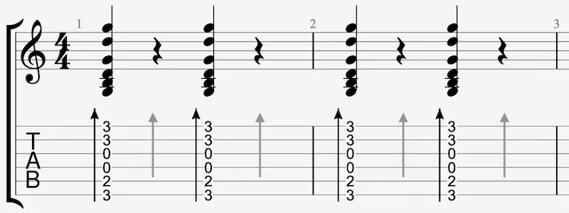 Pon tu metrónomo a 60 BPM. En lugar de tocar una nota en cada clic, toca un acorde de Sol mayor (G) simple en los tiempos 1 y 3. En los tiempos 2 y 4, simplemente haz un rasgueo "fantasma": mueve tu mano hacia abajo como si fueras a golpear las cuerdas, pero sin hacer contacto. Esto obliga a tu cuerpo a mantener el movimiento rítmico incluso cuando hay silencio.
