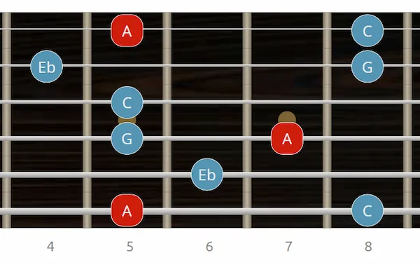 Esta es la posición más utilizada con tónica en 6ª cuerda, es una posición Drop3 (si quieres profundizar lee nuestro artículo sobre acordes Drop3).