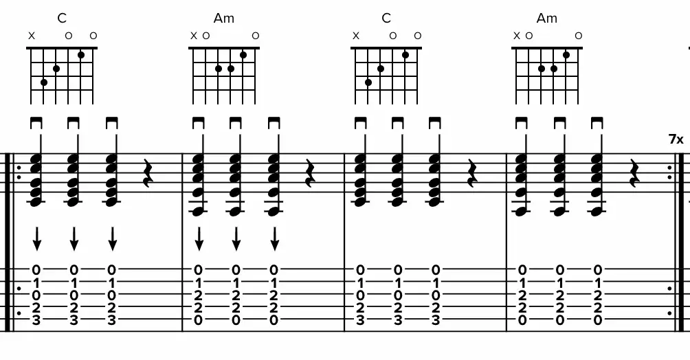En este ejemplo vemos que hay acordes, que puedes leer en la tablatura o en el diagrama de acordes superior. En este ejemplo hay dos indicaciones de dirección de púa: en la tablatura se indica con una flecha abajo que indica púa abajo. En el pentagrama puedes ver el símbolo convencional de púa abajo.
