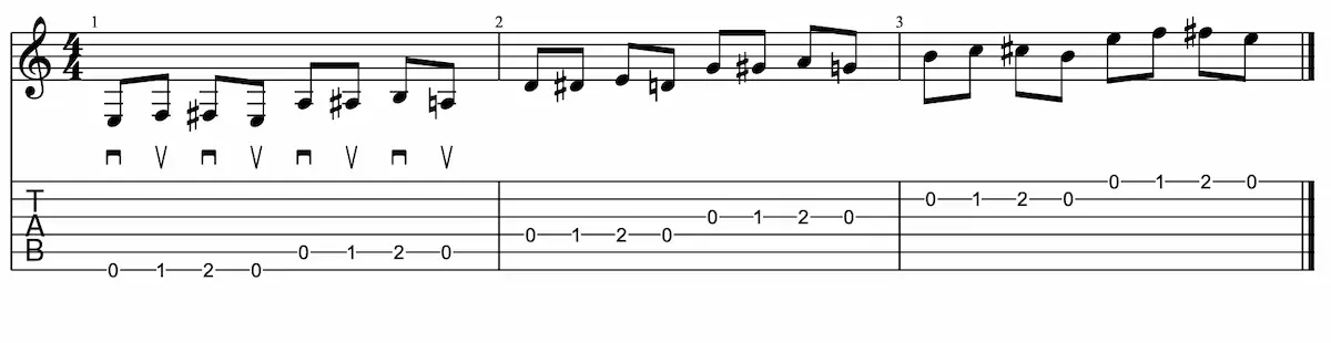 Aquó encontramos una tablatura junto a la notación en pentragrama. Podemos identificar los simbolos de dirección de púa que nos indican que tenemos que empezar púa abajo y luego seguir alternando en cada nota. Cuando un ejercicio sigue con el mismo patrón hasta el final se suele marcar la dirección de la púa solamente en uno o dos compases para evitar llenar la partituras de símbolos.