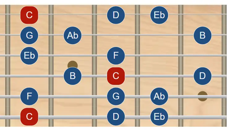 La escala menor natural o modo Eólico es junto a la escala mayor una de las más importantes en nuestro sistema musical. En la imagen puedes ver la escala de C menor con tónica en sexta cuerda.